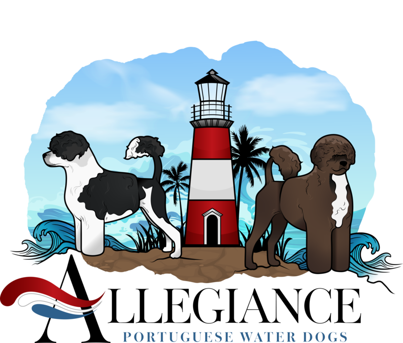 Each litter bred here at Allegiance is bred with the expectation of us keeping a puppy. We breed to further and enhance our breeding program and preserve the Portuguese Water Dog. We don’t just breed a litter to have puppies to sell. All our PWD pups are born and raised in our home their entire lives. The pups are extremely well socialized, exposed to children, adults, dogs, cats, noises, water and the outdoors. Our puppies are raised with the Puppy Culture principles, and we encourage our prospective homes to investigate the Puppy Culture program. We allow families to visit the puppies beginning at 4 weeks old until the last one has found their forever home. Our puppies go home no earlier than 8 weeks, more commonly they are 9 or 10 weeks when they move on to their forever families.
